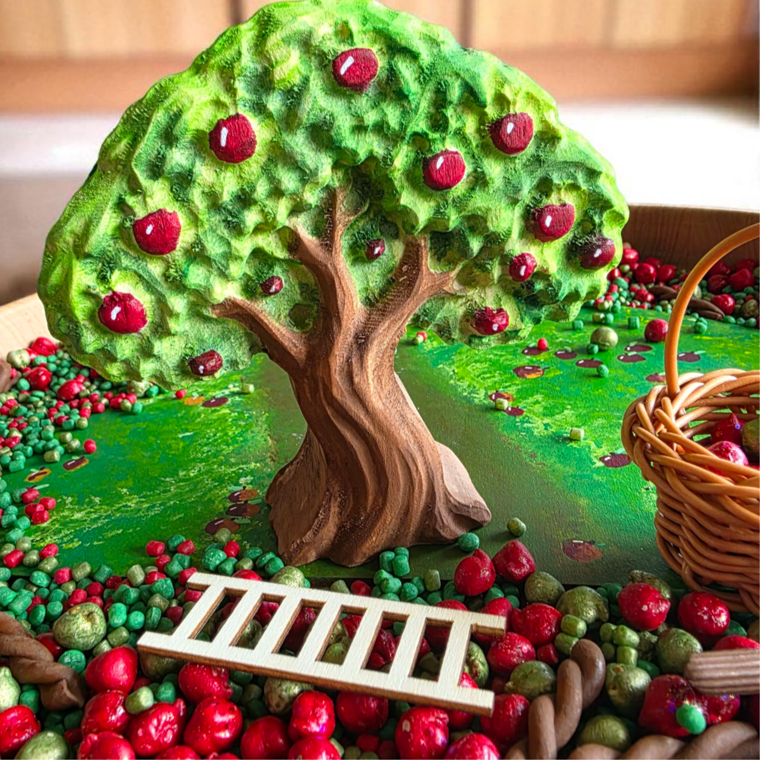 Apple Orchard kit includes: 1 solid maple apple tree (4.25"), 1 apple orchard playscape, 2 cups of apple orchard scented sensory filler, 1 mini ladder, 1 apple basket