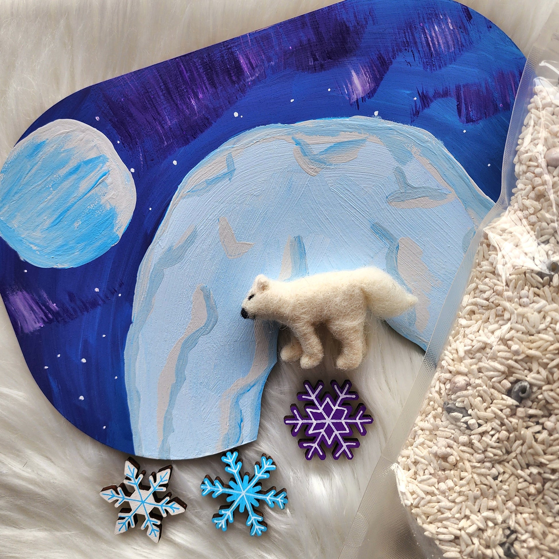 Kit includes: 1 Half size, hand-painted flisat cover, 4.5 cups of arctic snow filler, 1 felt arctic fox and 3 hand-painted arctic snowflakes.