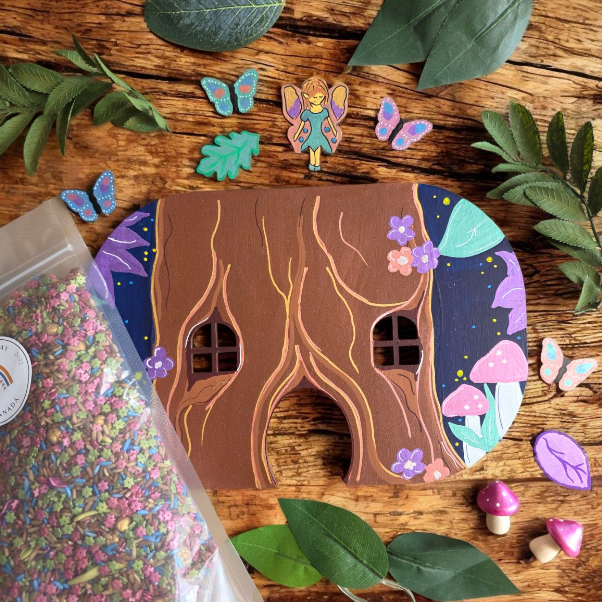 Kit includes: 1 maple, hand-painted half size flisat cover, 1 hand painted fairy, 4 enchanted butterflies, 2 enchanted leaves, 2 magical mushrooms, and 4.5 cups of scented fairy forest sensory filler.