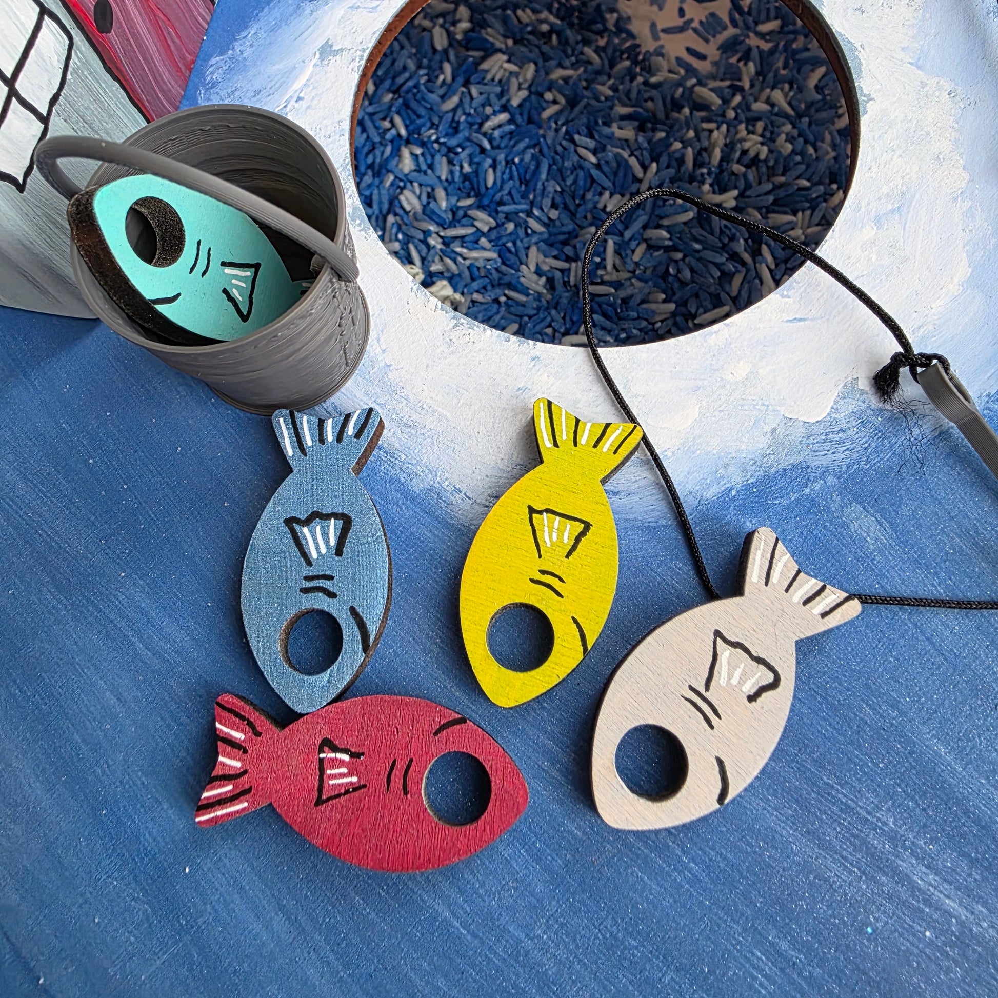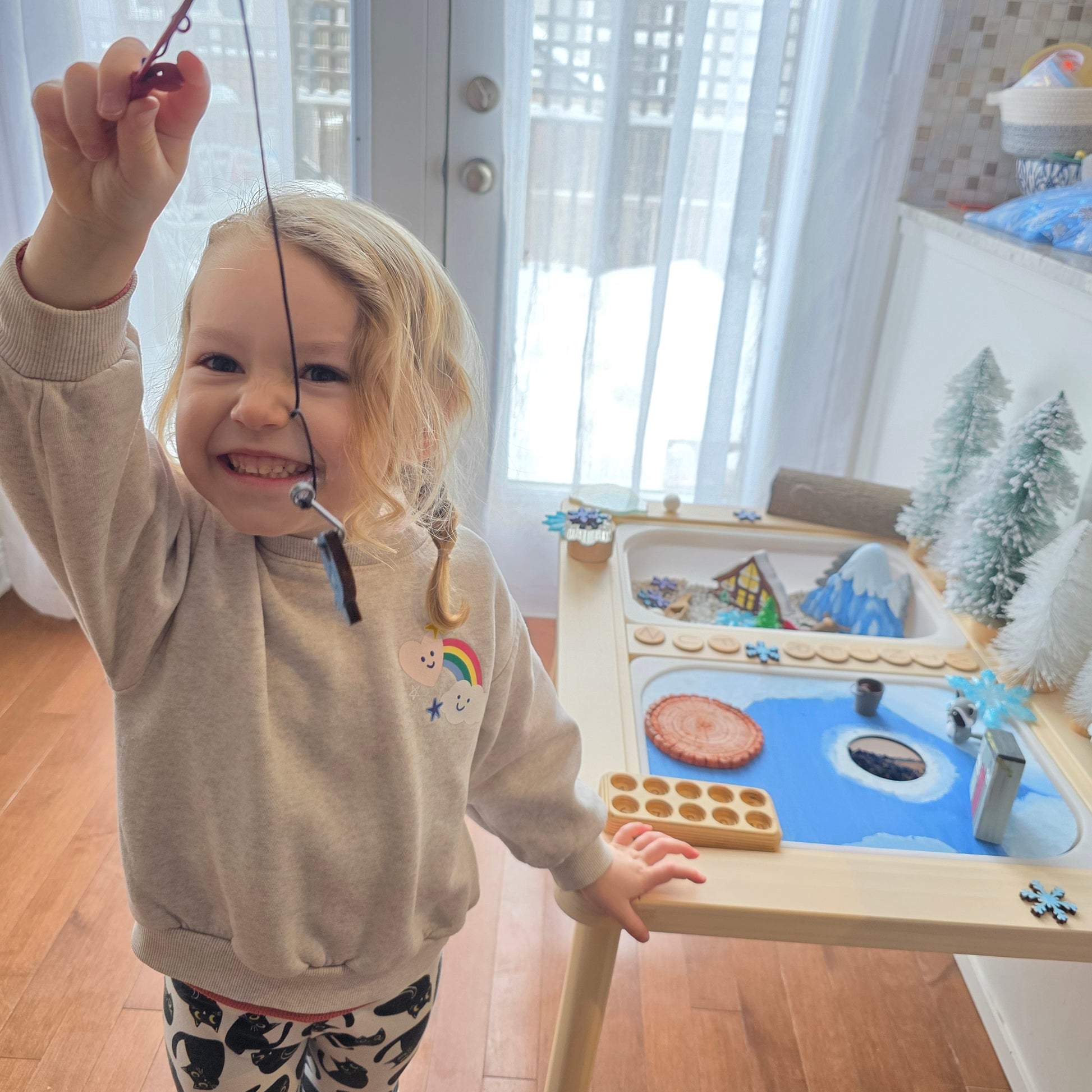 Kit includes: 1 maple, hand-painted frozen lake flisat cover, 1 hand-crafted, hand-painted solid maple ice fishing hut, 5 maple, hand-painted fish, 1 3d printed racoon, 1 3d printed bucket, 1 3d printed fishing rod and 4 cups of frozen lake sensory filler.
