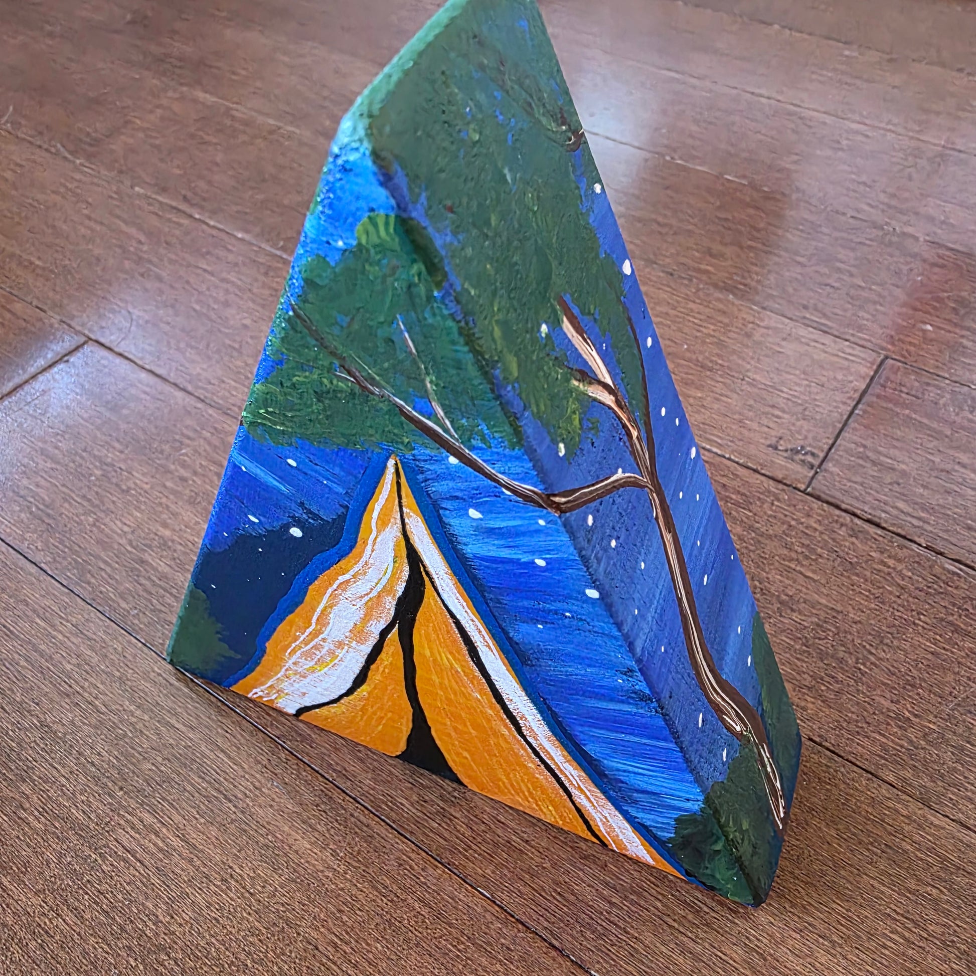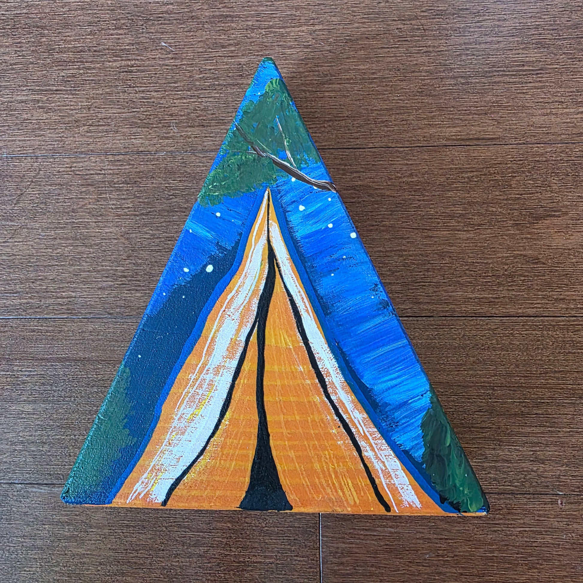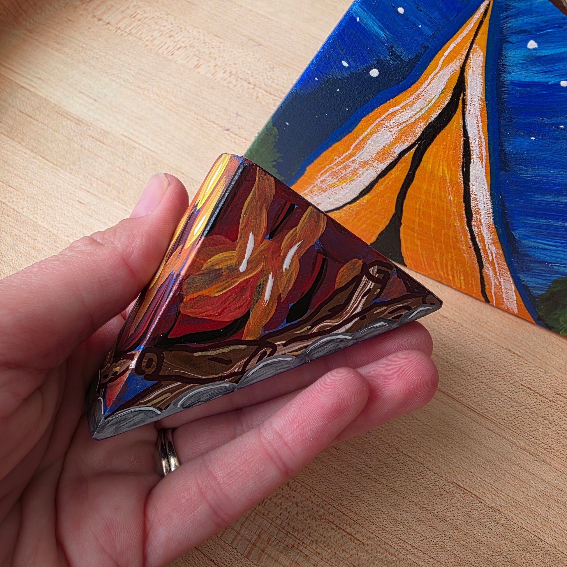Full Mini Kit includes: 1 hand-painted camp site playscape, 1 hand-painted tent story block, 1 small campfire block, 1 rectangle tree block, 3 small nocturnal animal blocks, 2 wooden leaves and 1.5 cups of scented soil filler.