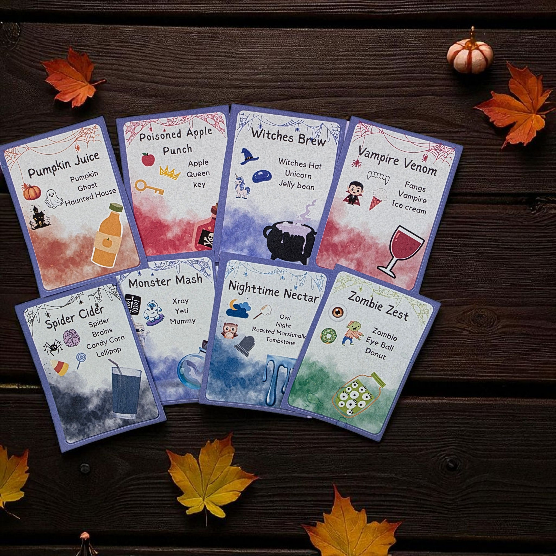 Full kit includes: 1 Crocheted cauldron with removable top, 26 maple, hand-painted potion alphabet pieces, 8 potion recipe cards, 1 metal witches spoon and 2 cups of grape crush scented sensory filler.